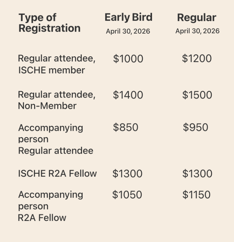 • ISCHE R2A Fellow registration additionally includes dinner on August 25 and meals and Fellows Day activities on August 26.